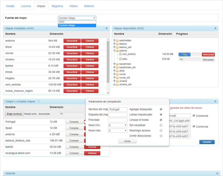 Si dispone de sus propios mapas, puede cargar e instalarlos en el servidor. Si el mapa es en el formato AVD, se coloca en la sección Mapas instalados. Para un mapa en cualquier otro formato hay que realizar compilación una vez cargado. Al cargar un archivo con los datos iniciales apriete el botón Compilar, ajuste los parámetros necesarios y apriete Iniciar. Del proceso de compilación se puede juzgar por el estado del botón Compilar/Eliminar. El proceso de compilación está terminado si el botón Eliminar ya no está disponible. Un mapa compilado con éxito cae en la sección Mapas instalados. Véase cómo se crean mapas AVD aquí.