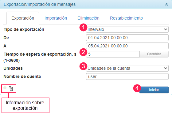 Igual que para la exportación, se puede especificar la duración de la pausa entre la importación de mensajes de diferentes unidades en el campo Tiempo de espera de importación.