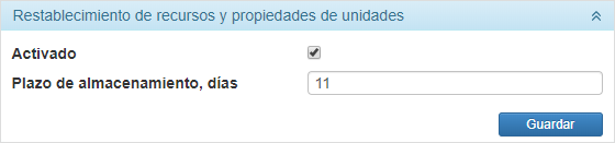Plazo de almacenamiento, días. En este campo se indica la cantidad días durante los cuales el usuario puede restablecer los datos modificados. El valor máximo posible es 90, el valor recomendado es 15.