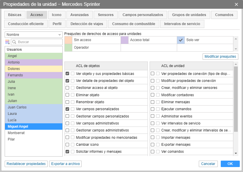 Los preajustes pueden facilitar y acelerar la configuración de los derechos de acceso. Usted puede crear varios conjuntos de derechos para varios propósitos. Pueden ser accesos para operadores, mánager, clientes, etc. Además, se puede crear preajustes para cada tipo de objeto (unidad, ruta, etc). Los preajustes creados se aplican a los usuarios elegidos por un clic del ratón.