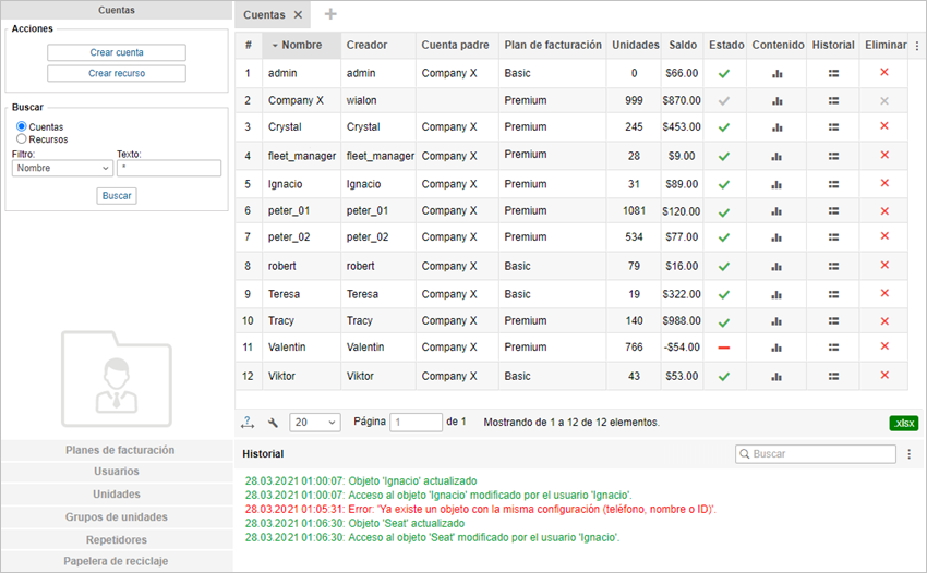 En el panel de resultados para una cuenta se muestra su nombre, el creador, la cuenta padre, el plan de facturación, la presencia de derechos de distribuidor, la cantidad de unidades en esta cuenta y en las cuentas subordinadas (considerando los derechos de acceso del creador), el saldo actual, la cantidad de días restantes (en la descripción emergente — la fecha del bloqueo), el estado (activa/bloqueada), la fecha del bloqueo de la cuenta (falta si la cuenta está activa) y los iconos para ejecutar un informe sobre el contenido de la cuenta, para abrir el historial y para eliminar la cuenta.
