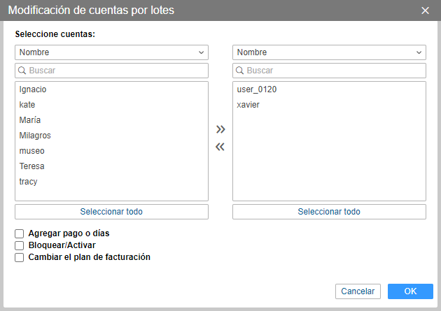 en la barra de herramientas. Traslade las cuentas necesarias de la lista izquierda a la derecha (para facilitar la búsqueda, hay disponible la filtración por nombre, creador, plan de facturación, campos personalizados o administrativos y el filtro dinámico).