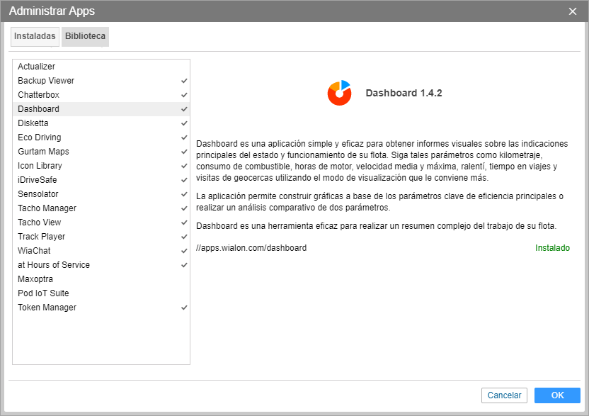Una vez apretado el botón, se abrirá la pestaña Instaladas donde se podrá cambiar los parámetros del funcionamiento de la aplicación en caso de ser necesario (cambiar la descripción, por ejemplo). Para terminar la operación, haga clic en Aplicar. Apriete OK para cerrar el diálogo.
