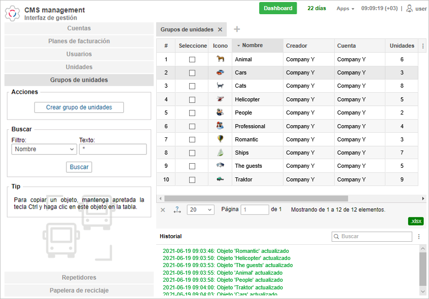 El panel de navegación y búsqueda está situado en la parte izquierda de la ventana. Aquí se puede cambiar entre varios objetos del sistema para buscar y manejarlos: cuentasplanes de facturaciónusuariosunidadesgrupos de unidadesrepetidores.