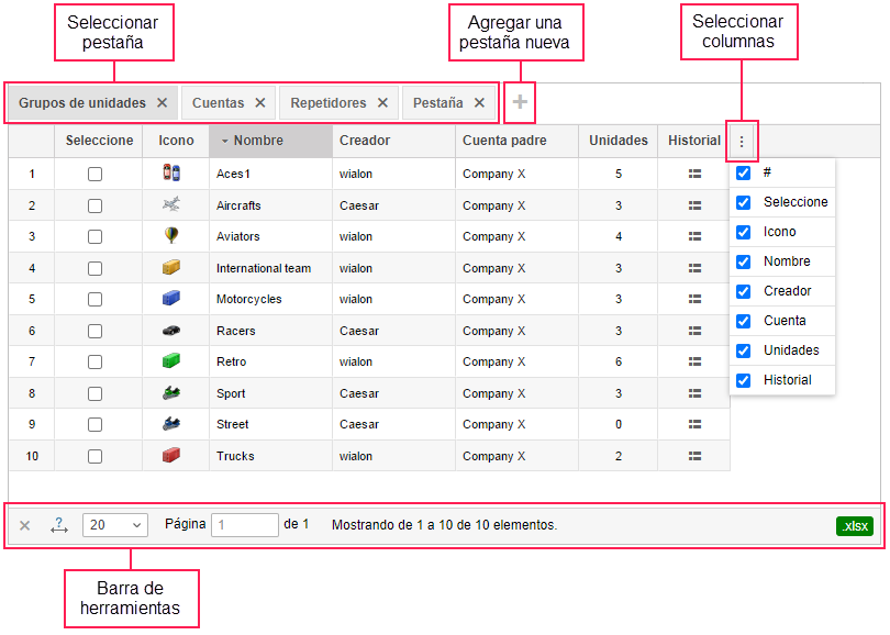 Debajo de la tabla está la barra de herramientas que permite realizar unas acciones: eliminar los objetos marcados, escoger la cantidad de líneas por página, navegar entre las páginas y otras. Además, mientras trabajar con tales objetos del sistema como cuentas, usuarios, unidades, grupos de unidades y repetidores se puede guardar los datos tabulares en el formato Excel. Para hacerlo, haga clic en el icono correspondiente en el rincón derecho de la barra de herramientas.