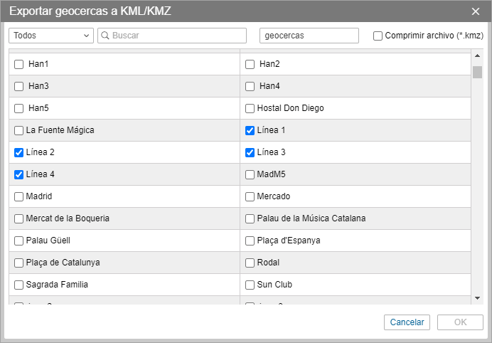 Durante la exportación a KML/KMZ se muestra la lista de todas las geocercas disponibles al usuario actual. Marque con vistos los que quiere exportar a un archivo.