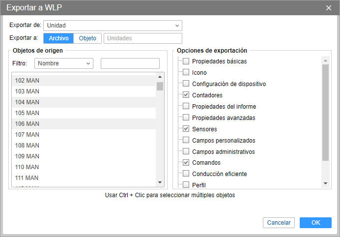 Durante la exportación a un objeto solo se puede elegir un objeto inicial. Escoja una unidad, recurso o usuario en la sección Objetos de origen. A la lista de objetos se puede aplicar el filtro dinámico que funciona según varios criterios. Una vez elegido el objeto de origen, su contenido disponible se mostrará a la derecha, en la sección Opciones de exportación. Aquí hay que escoger los datos para exportación. Para elegir todos los puntos de una vez, apriete Ctrl en el teclado y marque cualquier punto. Vuelva a hacer lo mismo para quitar la selección.