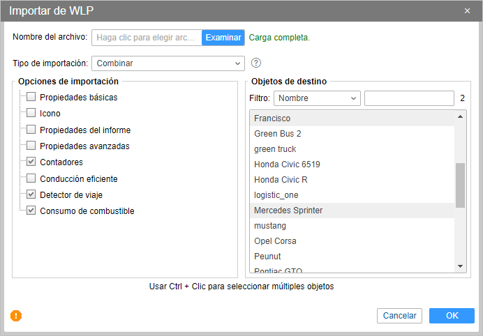 Esta opción permite importar propiedades de unidad, contenido de recurso o parámetros de usuario de un archivo WLP al objeto del tipo correspondiente: unidad, recurso o usuario. Para utilizar esta opción, necesita un archivo WLP previamente guardado.