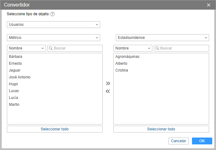 De esta lista se escogen los objetos que hay que convertir. En la parte derecha se muestran los objetos elegidos para la conversión. Se agregan por un doble clic o por medio del botón correspondiente (flecha hacia la derecha) ubicado entre las listas. Para borrar unos objetos también se utiliza un doble clic o el botón correspondiente (flecha hacia la izquierda) entre las listas. Para seleccionar varios objetos de una vez, apriete Ctrl. Para convertir los objetos agregados, apriete OK. Confirme sus acciones en la ventana aparecida. El resultado de la operación será reflejado en el historial.