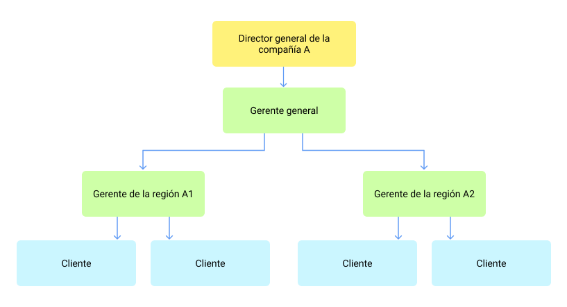 La compañía A suministra el software de rastreo satelital a las empresas de logística en las regiones A1 y A2. Sendos gerentes gestionan las cuentas de clientes de ambas regiones. Los gerentes de regiones se subordinan al gerente general que, a su vez, se subordina al director general de la compañía.