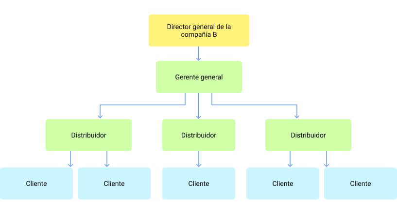 La compañía B coopera con distribuidores que suministran el software de rastreo satelital a las empresas de logística. El gerente general dirige las cuentas de distribuidores y se subordina al director general de la compañía B.