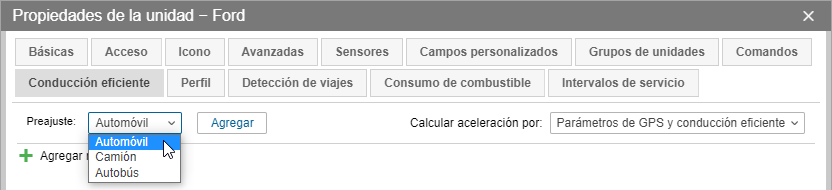 Para calcular la aceleración (aumento/disminución de velocidad, giro, conducción imprudente) en el sistema están previstos varios métodos de analizar datos: GPS, parámetros de conducción eficiente y método combinado (GPS y parámetros de conducción eficiente). Por defecto los datos se analizan de acuerdo con el método combinado. Si está elegido GPS, el cálculo de aceleracion se realiza de acuerdo con los datos de posición. Si están elegidos los parámetros de conducción eficiente, el cálculo se realiza a base de los parámetros especiales que contienen el valor máximo de aceleraciones en el intervalo entre los mensajes. Solo algunos equipos pueden transmitir estos parámetros. Si está elegido el método combinado, el cálculo se realiza de acuerdo con los datos de posición y los parámetros recibidos del dispositivo; luego el sistema escoge el valor mayor. Cabe subrayar, que el método elegido se aplica a todos los criterios configurados.