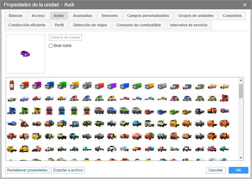 En la pestaña Icono de las propiedades de la unidad se puede escoger un icono para visualizar la unidad en el mapa y en todo tipo de listas de unidades.