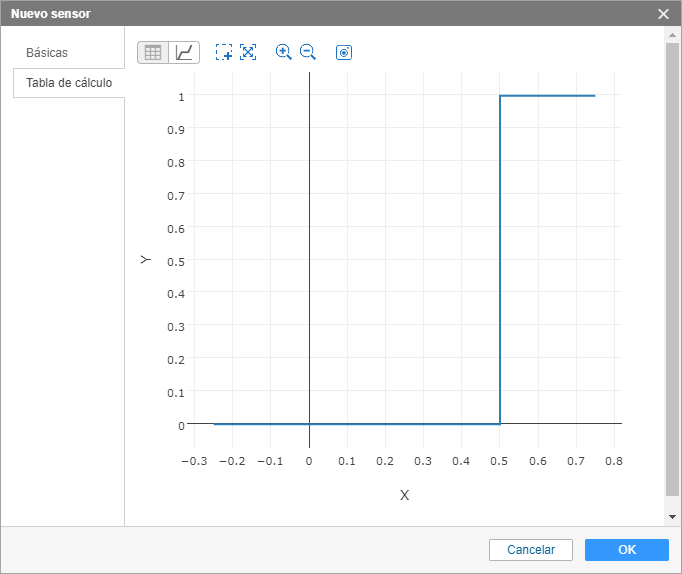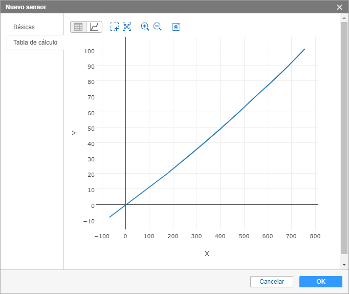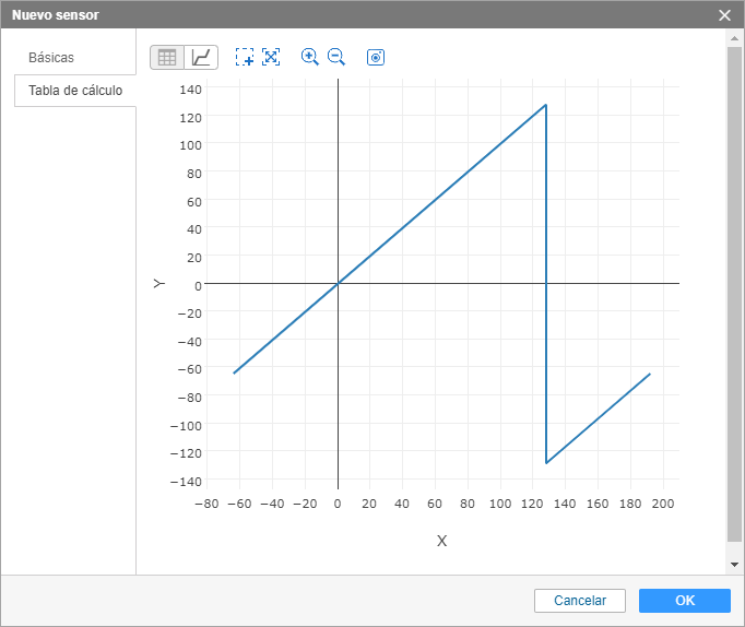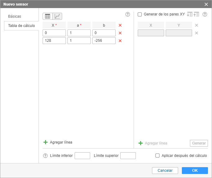 Este modo de crear una tabla de cálculo para un sensor es menos complicado. Es bastante introducir los valores entrantes X y los valores salientes Y que los correspondan. El asistente para tabla de cálculo está en la parte derecha del cuadro de diálogo. Está desactivado por defecto. Para utilizar esta herramienta hace falta activar el visto Generar de los pares XY.