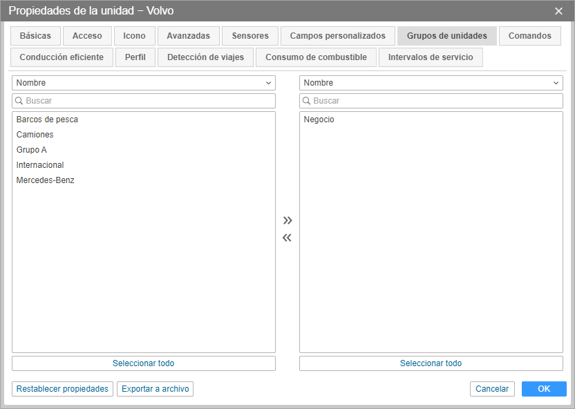 A la izquierda está la lista de grupos existentes; y a la derecha, solo los grupos a que pertenece dada unidad. Utilice los botones Agregar/Eliminar para incluir una unidad en un grupo o excluirla de este.