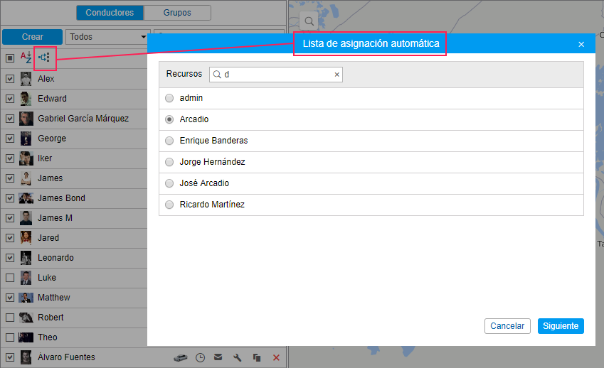 ) y cree para cada recurso su lista de unidades, a que pueden asignarse los conductores de la lista automáticamente.