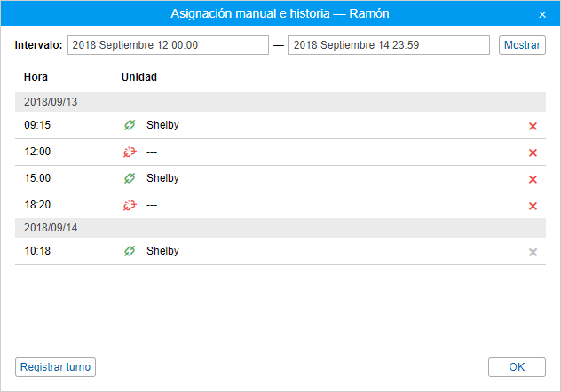 Esta opción permite ver la historia de asignaciones, eliminarlas si es necesario y registrar un turno laboral manualmente. Para realizar estas acciones, apriete el icono Registrar intervalo laboral (