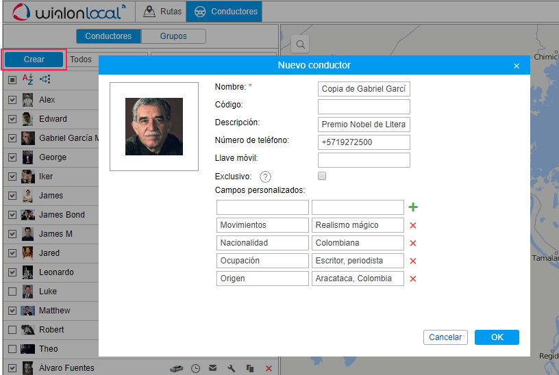 Para mejor identificación visual del conductor, se puede adjuntar su foto (o cualquier otra imagen). Apriete el campo con el retrato esquemático y escoja un archivo del disco. Se recomienda cargar fotos cuadradas para que no se deformen sus proporciones. Los formatos soportados son PNG, JPG, GIF y SVG. Se puede eliminar la imagen mientras modificar las propiedades del conductor. Para hacerlo, apúntela con el ratón y apriete el botón correspondiente aparecido (cruz). Apriete OK para guardar los cambios. Si quiere cancelar las modificaciones, apriete Cancelar.