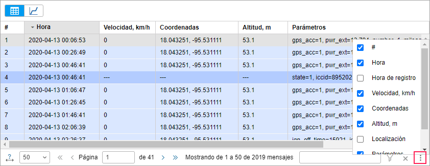 ubicado en el rincón derecho inferior de la ventana. Escoja qué columnas tienen que mostrarse y qué no en la lista desplegable. No se puede ocultar todas las columnas simultáneamente. Si está elegida la visualización de sensores con sus valores, habrá una columna para cada sensor. Por defecto solo se muestran sensores visibles, los demás pueden activarse manualmente.