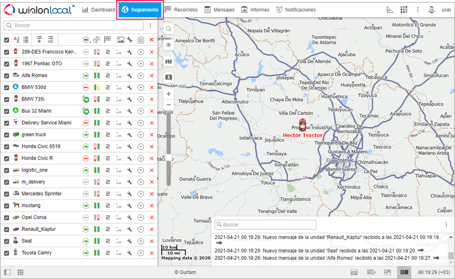 En la pestaña Seguimiento están disponibles las principales funciones de rastreo satelital. Aquí puede ver el movimiento de las unidades en el mapa, enviarles comandos y mensajes, solicitar fotos y vídeos, seguir los cambios de parámetros en línea, etc.