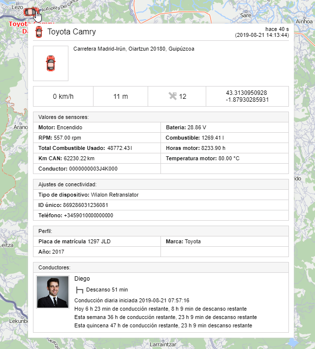 La descripción emergente de una unidad se muestra al apuntarla con el cursor del ratón en el mapa, en la lista de trabajo, en algunas ventanas de diálogo, etc. Su contenido se configura en los parámetros del usuario. Se puede copiar la información de una descripción emergente por medio de seleccionar el fragmento necesario y copiarlo al portapapeles. Una descripción emergente puede ser así: