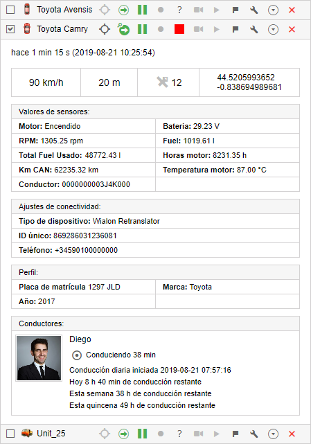 Además de la descripción emergente, se puede recibir información adicional sobre una unidad al apretar su icono en la lista de trabajo de la pestaña Seguimiento (tanto en el modo de unidades, como en el modo de grupos de unidades). Su contenido también se ajusta en los parámetros del usuario.