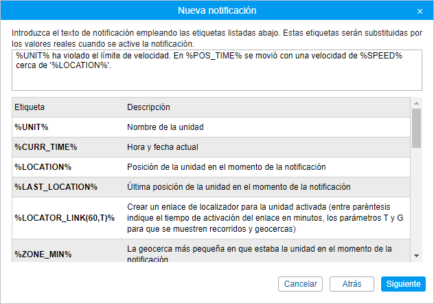 Si los datos se desconocen, las etiquetas se muestran como son sin reemplazarse por valores reales. Las siguientes etiquetas son una excepción, ya que a falta de datos no aparecen en el texto de notificación: %UNIT%, %USER%, %CURR_TIME%, %LOCATION%, %LAST_LOCATION%, %SPEED%, %POS_TIME%, %MSG_TIME%, %UNIT_GROUP%, %ENGINE_HOURS%, %MILEAGE%, %LAT%, %LON%, %LATD%, %LOND%, %GOOGLE_LINK%, %INSURANCE_CASE%, %ZONES_ALL%, %ZONE_MIN%, %UNIT_ID%, %MSG_TIME_INT%, %NOTIFICATION%, %TAG_NAME%, %TAG_ID%, %LOSE_RESTORE%, %LOCATOR_LINK%.
