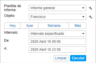 La selección de un intervalo rápido se realiza por medio de apretar los botones Hoy, Ayer, Semana, Mes. El informe se genera en tal caso inmediatamente, no se necesita apretar el bóton Ejecutar.