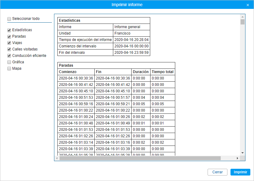 En la parte izquierda de la ventana del diálogo se muestra la lista de tablas, gráficas y otras secciones que contiene el informe. En la parte derecha se puede revisar su contenido. Escoja las secciones que quiere imprimir. Apriete el botón Imprimir. Para salir del diálogo, apriete Cerrar.