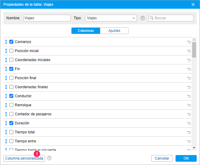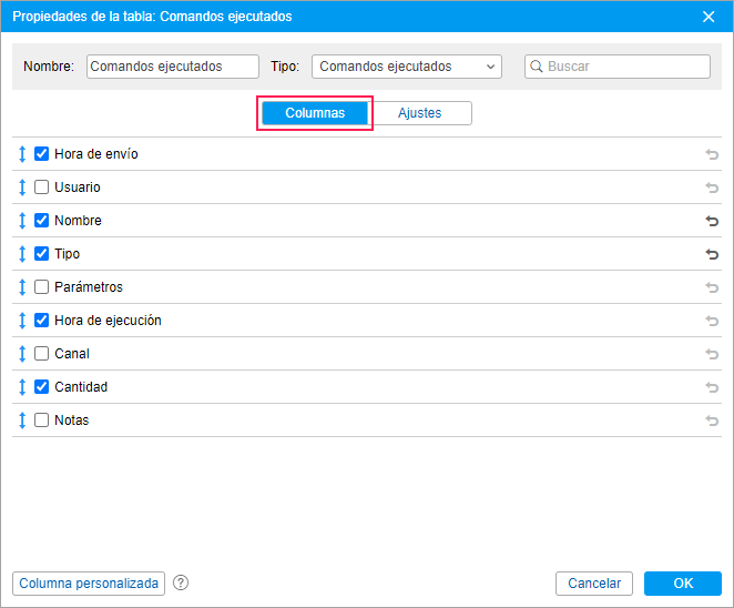 Para cada tabla, además de la selección de columnas, están disponibles los siguientes ajustes que están ubicados en la pestaña del mismo nombre.