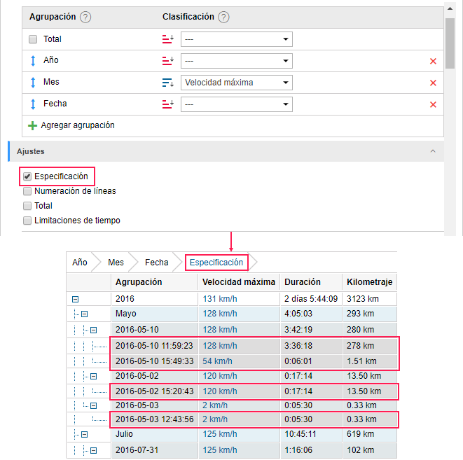 La especificación solo puede aplicarse a las tablas agrupadas. En otros casos no tiene sentido. Una exclusión son los informes por grupos de unidades, conductores, remolques y pasajeros, porque en ellos está prevista la agrupación por unidades por defecto.