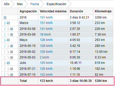En Total no se muestra la información para los campos con texto y otros datos que no pueden ser resumidos de ninguna manera. Tampoco se muestra la información para datos sobre la ubicación, excepto la información sobre la posición inicial y final en los informes por unidades. En este caso para la posición inicial se muestra aquella que se ha detectado la primera en el período de informe; para la posición final, la que se ha detectado la última.