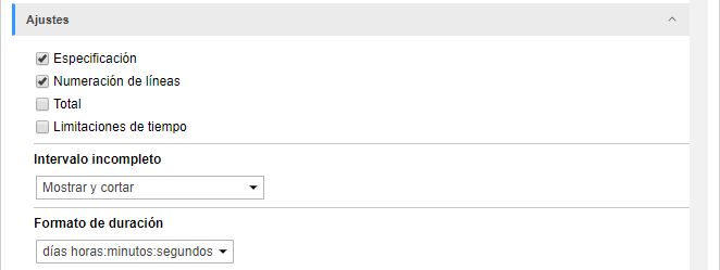 | horas:minutos:segundos | La duración en el informe se muestra en el formato del tipo 132:34:56, es decir, las horas no se unen en días (si son más de 24). La opción no solo atañe a las células, sino también a la fila Total. |