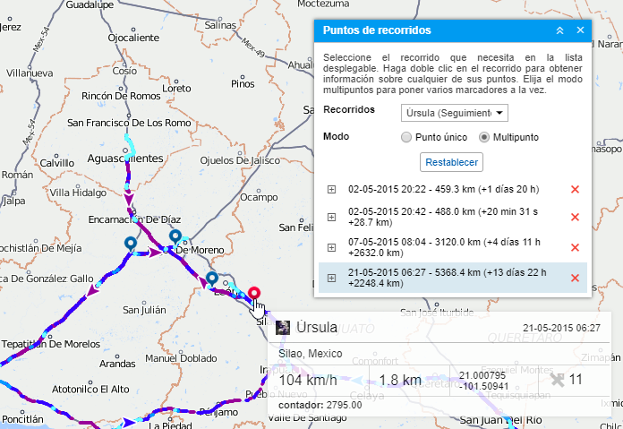 • En la pestaña Recorridos se puede obtener los recorridos de la unidad por el intervalo temporal indicado.
