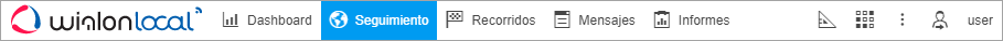 En la barra de herramientas superior, a la izquierda se sitúa el logo del proveedor del servicio de rastreo; a la derecha, el botón de la configuración del menú y el nombre de usuario con el que ha iniciado la sesión.