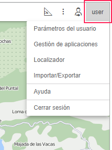 En el rincón derecho de la barra superior se muestra el nombre de usuario con el que ha iniciado la sesión. Junto con este entre paréntesis puede mostrarse otro nombre si el usuario principal ha entrado bajo el nombre de otro.