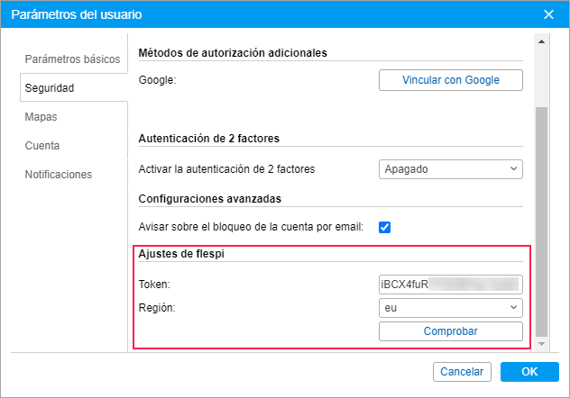 El campo con el token generado se muestra después de la autorización en flespi. El término de vigencia del token es de un año. Para ver el estado (activo/caducado) y el término de vigencia del token, apriete el botón Comprobar. Si es necesario, se puede introducir el token manualmente.