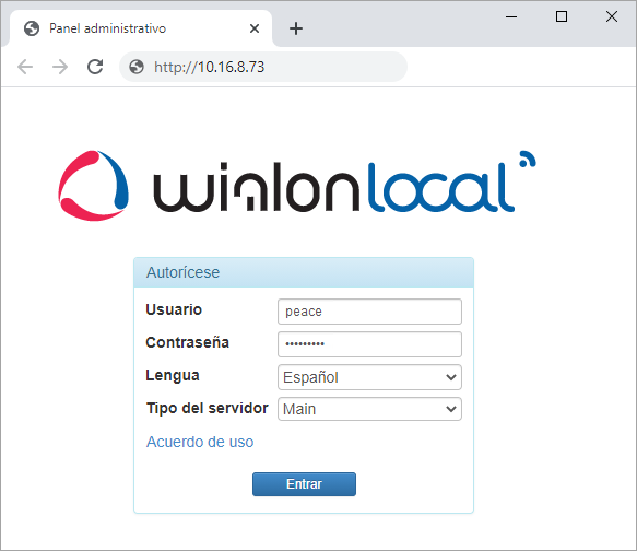 Introduzca esta URL en la barra de direcciones de un navegador en un ordenador con interfaz gráfica que tenga acceso al servidor con Wialon Local. Para autorizar, utilice el nombre de usuario y la contraseña que se le proporcionaron al comprar Wialon Local. En el campo Tipo del servidor, seleccione Main si está instalando Wialon Local para el servidor principal. Seleccione Backup si está instalando Wialon Local para el servidor de copia de seguridad. Consulte más detalles en Instalación del servidor de copia de seguridad.
