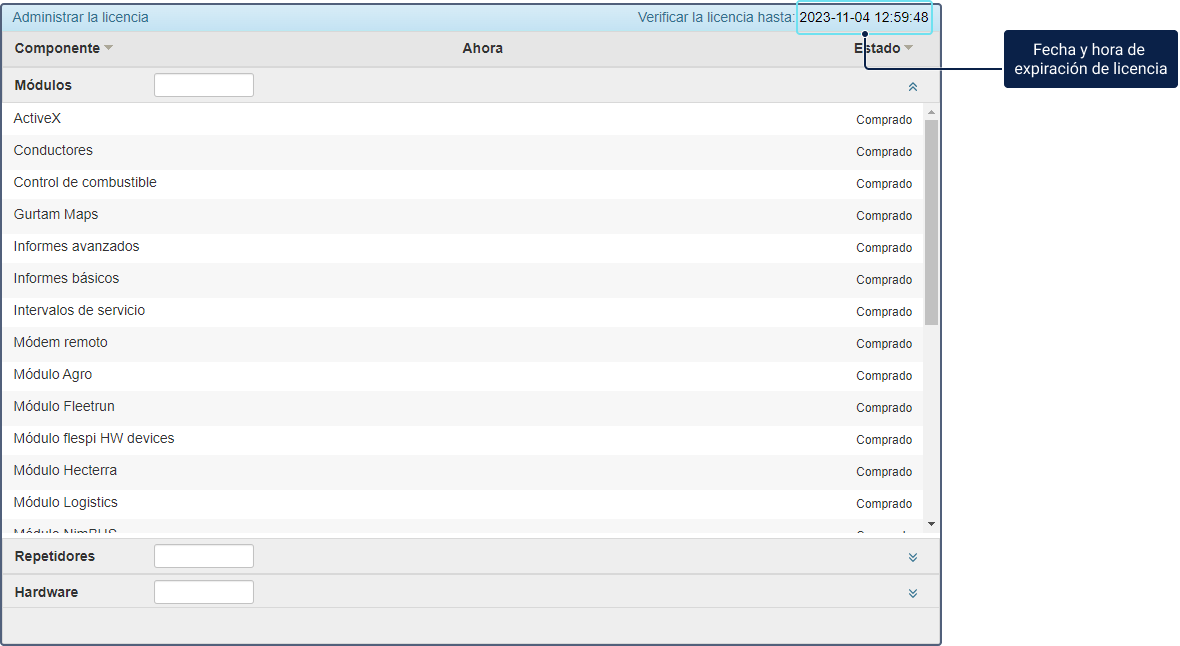 En el rincón superior derecho del bloque se puede ver la fecha y hora en que finaliza el plazo de validez de la licencia. Si quedan menos de 12 horas hasta que expire este plazo, al lado de la fecha aparece un indicador de color amarillo. Si la licencia ya ha expirado, un indicador de color rojo. También el indicador de color rojo significa que no hay conexión a Internet que es necesaria para mantener la conexión con el servidor de licencias y una operación correcta de Wialon Local.