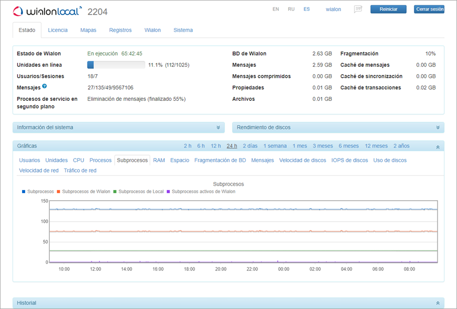 En la pestaña Estado se muestra información sobre los parámetros principales del funcionamiento del servicio en tiempo real.
