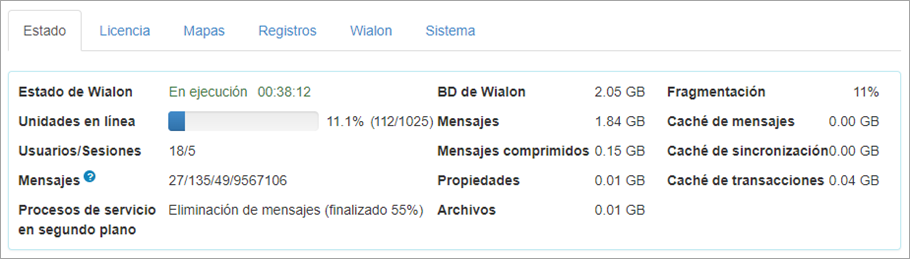 | Estado de Wialon | Es el estado actual de Wialon Local: en ejecución o detenido. Para el estado En ejecución se muestra su duración en el formato horas:minutos:segundos. |