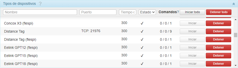 En esta columna se muestra la cantidad de comandos que están disponibles para dispositivos de este tipo y que pueden enviarse por los canales TCP, UDP y Virtual. En la descripción emergente aparece la información detallada con los nombres de todos los comandos para cada canal.