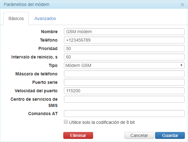 | Velocidad del puerto | La velocidad del puerto del módem GSM. Si mientras operar aparecen errores, reduzca este valor. |