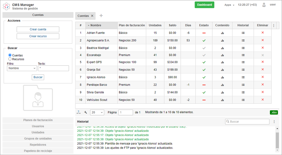 El sistema de gestión CMS Manager está diseñado para los usuarios de nivel superior y usuarios con derechos de distribuidor y les permite configurar la estructura del servicio, gestionar cuentas, recursos, usuarios, unidades y otros macroobjetos del sistema.