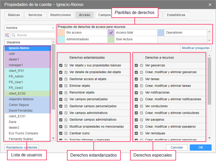 En la parte izquierda de la ventana, se muestra la lista de usuarios a los que puede conceder los derechos de acceso a la cuenta. Los nombres de usuarios que tienen al menos uno de estos derechos quedan resaltados con un fondo de color.