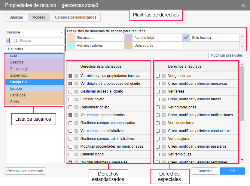 En la parte derecha se muestran los derechos de acceso al recurso que pueden ser concedidos al usuario. Los derechos están divididos en dos tipos: estandarizados y especiales (derechos al recurso).