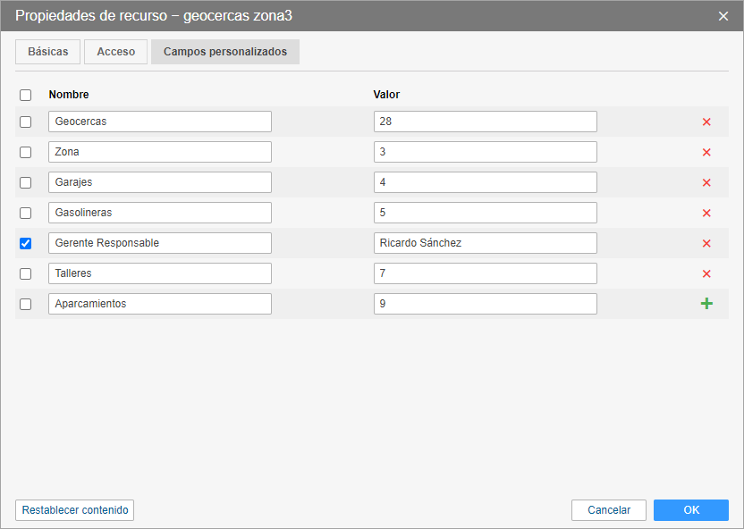 En esta pestaña puede crear campos personalizados con información adicional sobre el recurso.