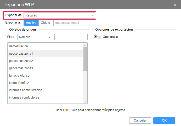 Para exportar el contenido del recurso, seleccione el punto Exportar a WLP en el menú de usuario y, en la ventana, que se ha abierto indique Recurso en el campo Exportar de. Vea la guía detallada aquí.