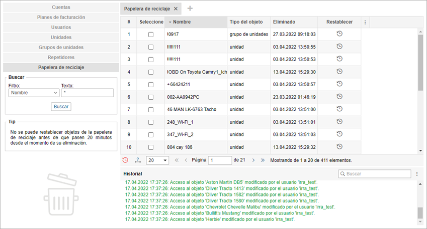 En la papelera pueden caer los siguientes macroobjetos del sistema: recurso, unidad, grupo de unidades, usuario, ruta, repetidor.