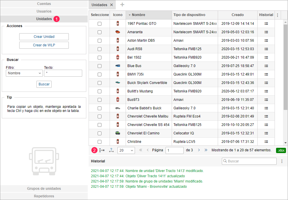 - En la lista izquierda seleccione las unidades que desea transferir a otra cuenta. Para encontrar la unidad necesaria, utilice el filtro dinámico sobre la lista.